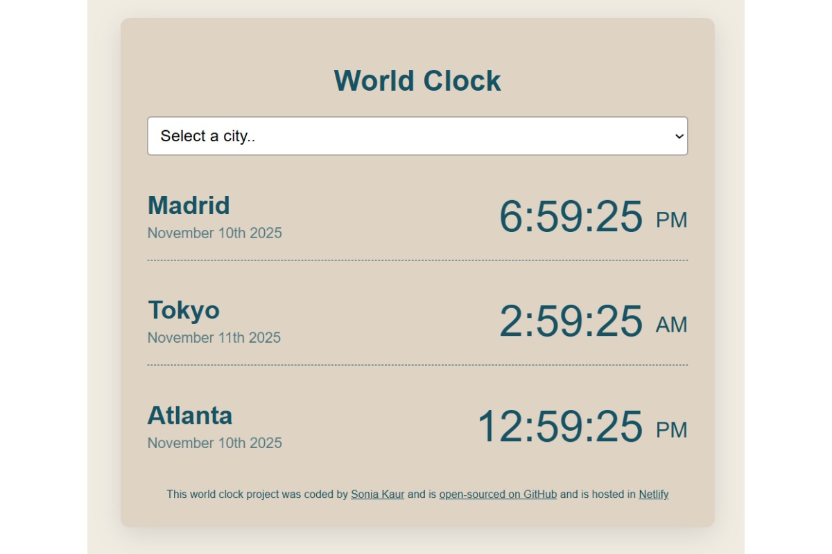 Launch Weather ProjectAn interactive web app built with JavaScript, HTML, and CSS that displays the current time and date across multiple cities worldwide. Users can select their location or explore different time zones through a dynamic and responsive interface powered by the Moment.js library.